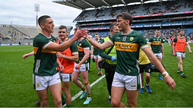 Joe O'Connor, left, and David Clifford of Kerry celebrate after the GAA Football All-Ireland Senior Championship quarter-final