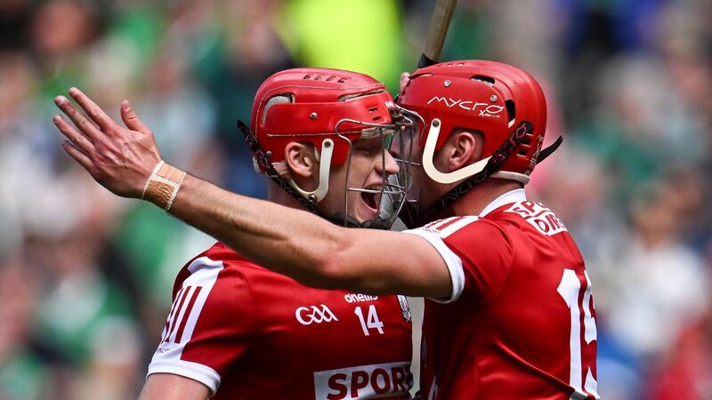 Cork's Brian Hayes, right, celebrates with teammate Alan Connolly after scoring his side's second goal, which was subsequently disallowed. Pic: Seb Daly/Sportsfile