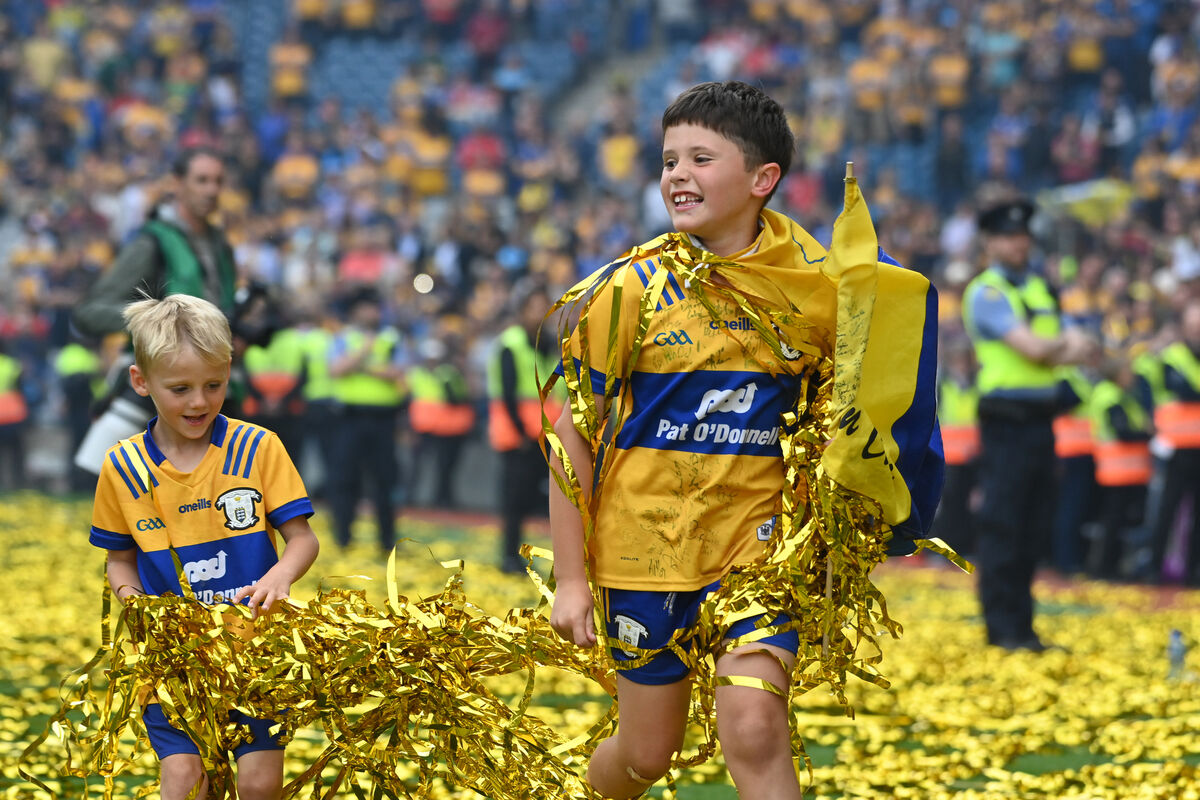 Young Clare fans Iarla and Darrgah play with the gold ribbons after the cup presentation. Pic: Larry Cummins