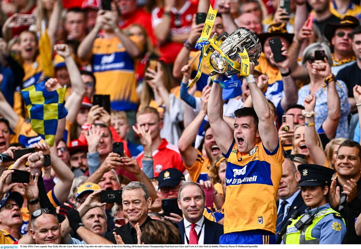 Clare captain Tony Kelly lifts the Liam MacCarthy Cup. Photo by Piaras Ă“ MĂdheach/Sportsfile