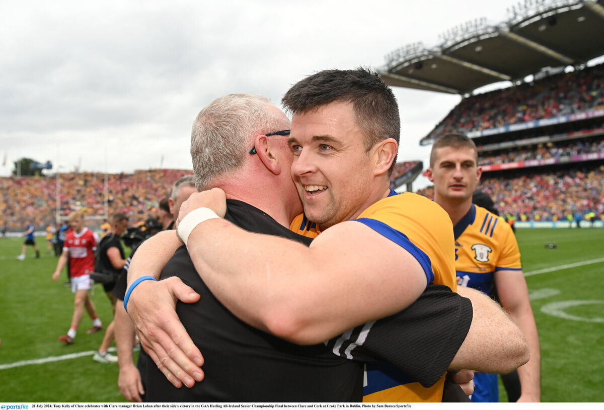 Tony Kelly of Clare celebrates with manager Brian Lohan. Photo by Sam Barnes/Sportsfile