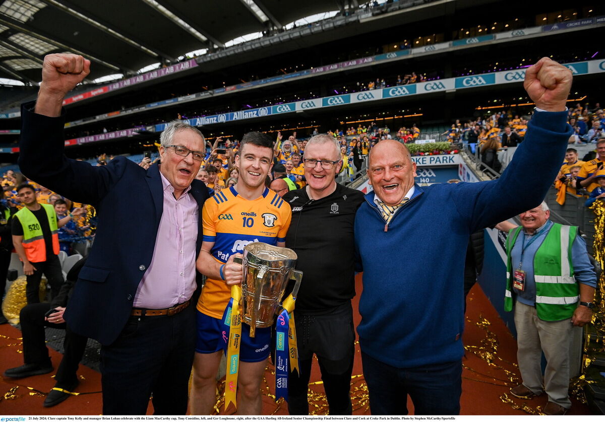 Clare captain Tony Kelly and manager Brian Lohan celebrate with the Liam MacCarthy cup, Tony Considine, left, and Ger Loughnane. Photo by Stephen McCarthy/Sportsfile