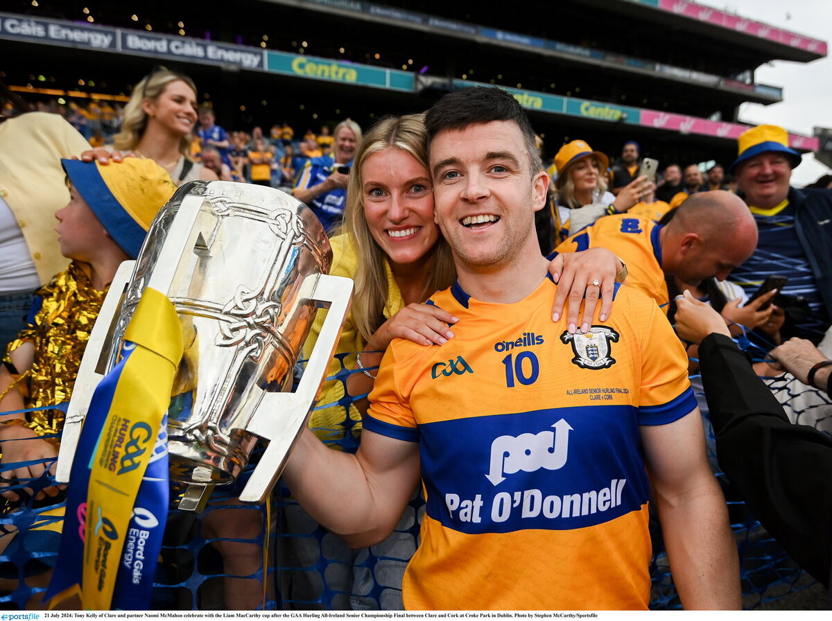 Tony Kelly of Clare and partner Naomi McMahon celebrate with the Liam MacCarthy Cup. Photo by Stephen McCarthy/Sportsfile