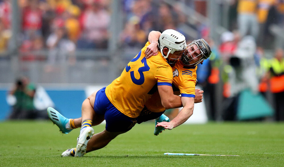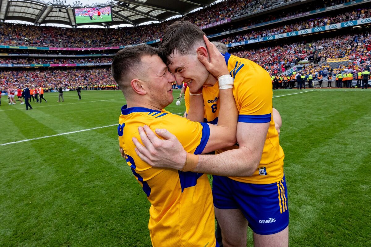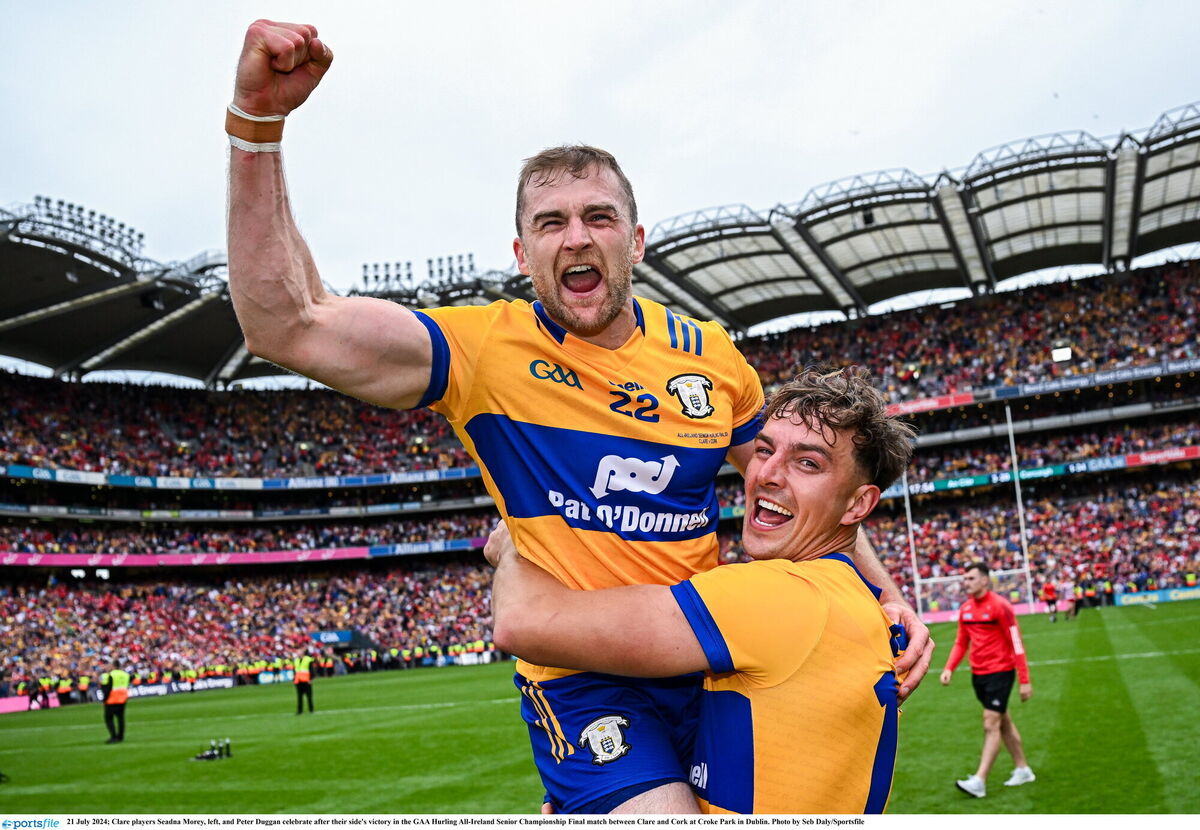 Clare players Seadna Morey, left, and Peter Duggan celebrate. Photo by Seb Daly/Sportsfile