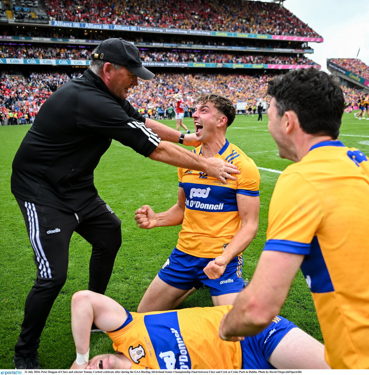 Peter Duggan of Clare and selector Tommy Corbett celebrate. Photo by David Fitzgerald/Sportsfile