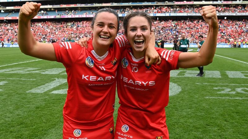 JOYOUS SCENES: Cork players Fiona Keating and Saoirse McCarthy defeating Galway. Pic: Eddie O'Hare