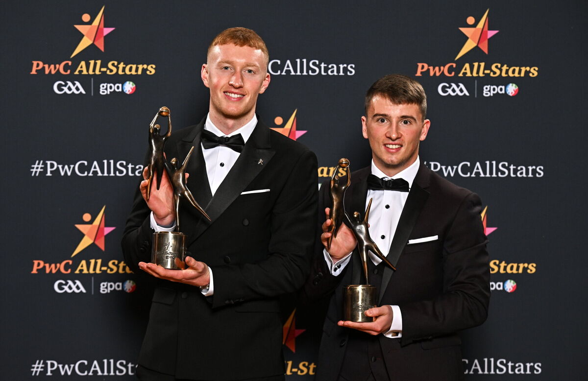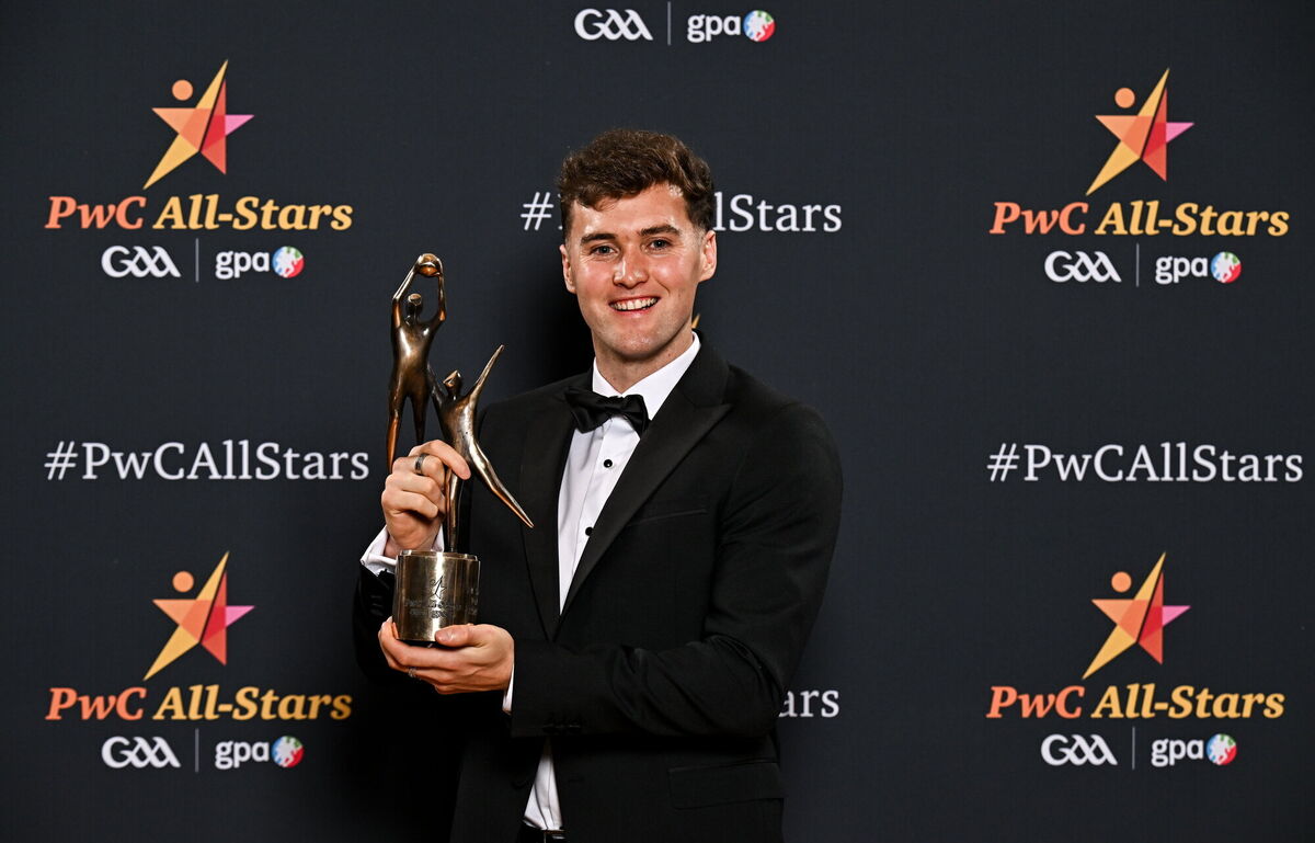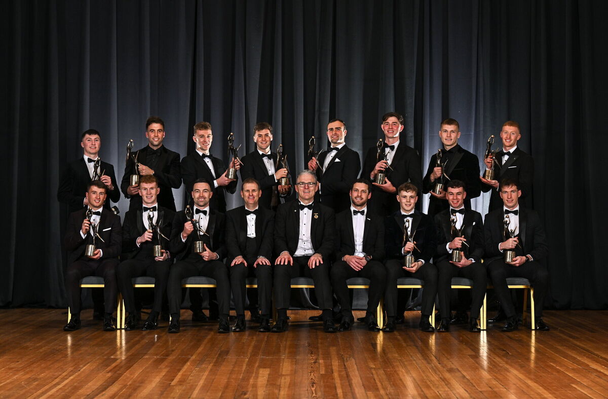 Uachtarán Chumann LĂşthchleas Gael Jarlath Burns, centre front, with back row, from left, Oisin Conaty of Armagh, Paul Conroy of Galway, Dylan McHugh of Galway, Rob Finnerty of Galway, John Maher of Galway, Ben Crealey of Armagh, Rian O’Neill of Armagh and OisĂn Gallen of Donegal, with front row, from left, Peadar Mogan of Donegal, Conor Turbitt of Armagh, Aidan Forker of Armagh, PwC partner Michael McDaid, Gaelic Players Association chief executive Tom Parsons, Johnny McGrath of Galway, Craig Lennon of Louth, and Barry McCambridge of Armagh. Pic: Sam Barnes/Sportsfile