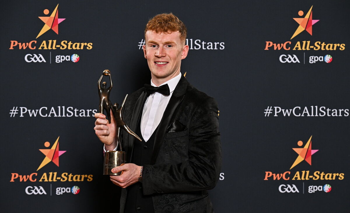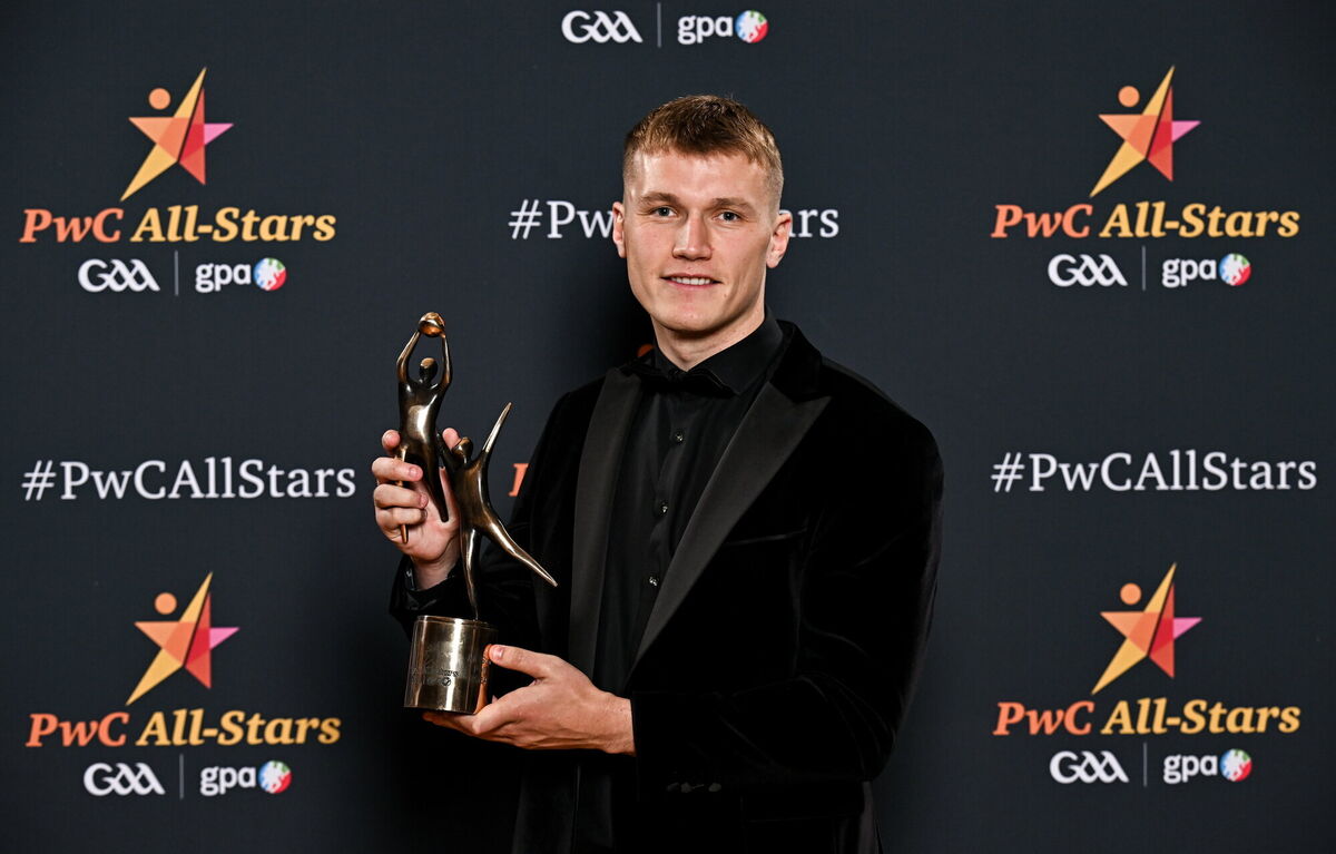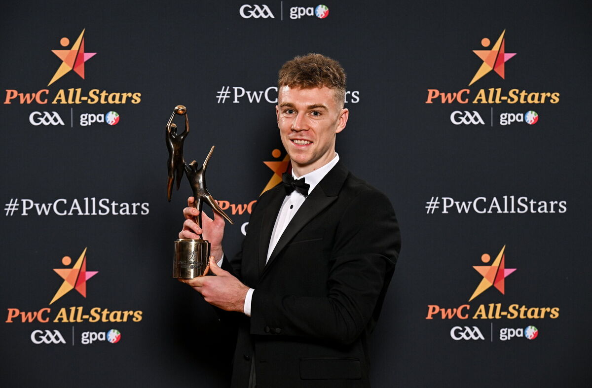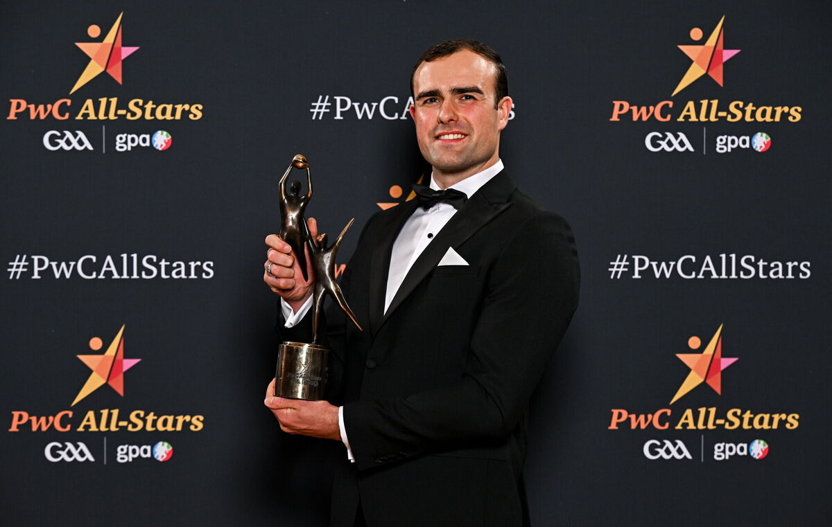 Uachtarán Chumann LĂşthchleas Gael Jarlath Burns, centre front, with back row, from left, Oisin Conaty of Armagh, Paul Conroy of Galway, Dylan McHugh of Galway, Rob Finnerty of Galway, John Maher of Galway, Ben Crealey of Armagh, Rian O’Neill of Armagh and OisĂn Gallen of Donegal, with front row, from left, Peadar Mogan of Donegal, Conor Turbitt of Armagh, Aidan Forker of Armagh, PwC partner Michael McDaid, Gaelic Players Association chief executive Tom Parsons, Johnny McGrath of Galway, Craig Lennon of Louth, and Barry McCambridge of Armagh. Pic: Sam Barnes/Sportsfile