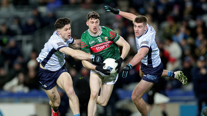 Mayo's Davitt Neary with David Byrne and Greg McEneaney of Dublin. Pic: ©INPHO/Laszlo Geczo