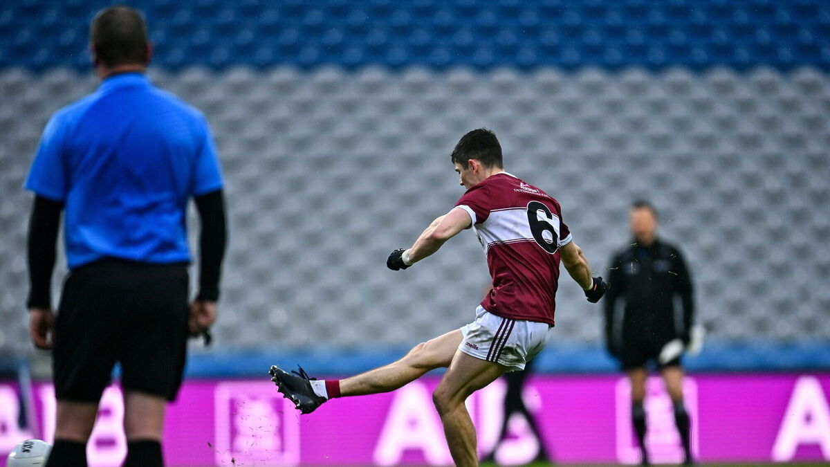 MEANT TO BE: Conor Loftus of Crossmolina Deel Rovers shoots a penalty in the final moments of the All-Ireland Intermediate Club Championship final with Ballinderry. Pic: Tyler Miller, Sportsfile