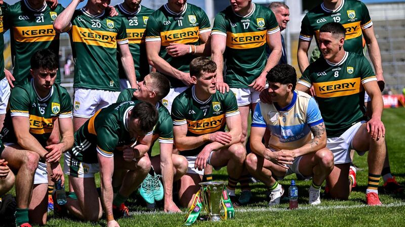 Kerry players, including captain Gavin White, 7, with the trophy after victory in the Munster SFC final. Photo by Piaras Ó MÃdheach/Sportsfile