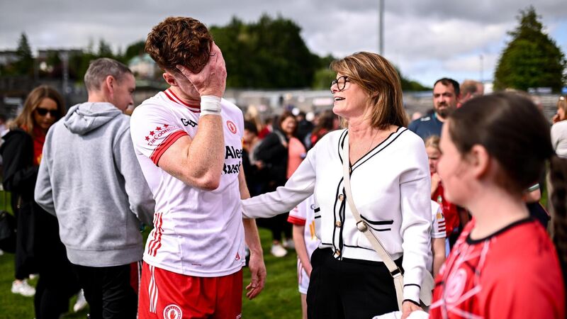 An emotional Conor Meyler of Tyrone is consoled by his mother Paula following his return to action after a 23 month absence due to injury after the GAA Football All-Ireland Senior Championship Round 3 match between Tyrone and Cavan at Brewster Park in Enniskillen, Fermanagh. Photo by Ben McShane/Sportsfile