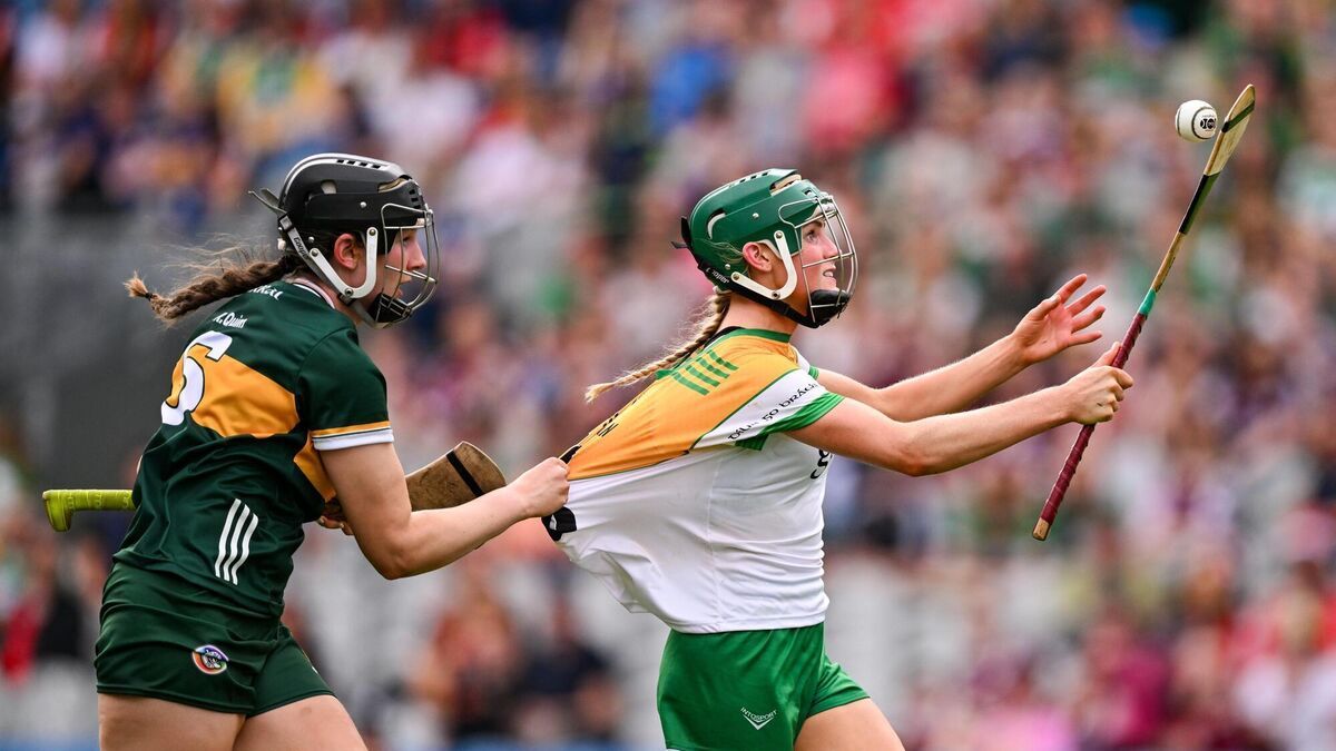 HANGIN IN THRE: Grace Teehan of Offaly is fouled by Roisin Quinn of Kerry during the Glen Dimplex All-Ireland Intermediate Camogie Championship final match between Offaly and Kerry at Croke Park in Dublin. Pic: Ramsey Cardy/Sportsfile