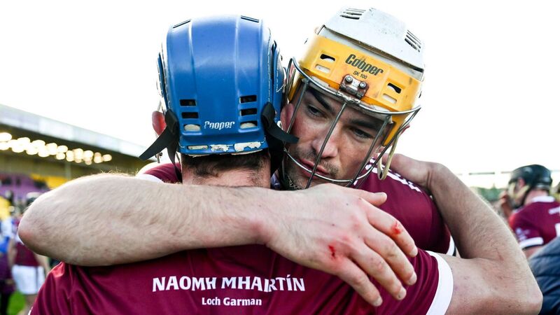 Barry O'Connor (right) embraces St Martin's colleague Conor Firman after securing their final spot in the Leinster Club SHC decider with a win over Naas at Chadwicks Wexford Park. Pic: Tyler Miller/Sportsfile