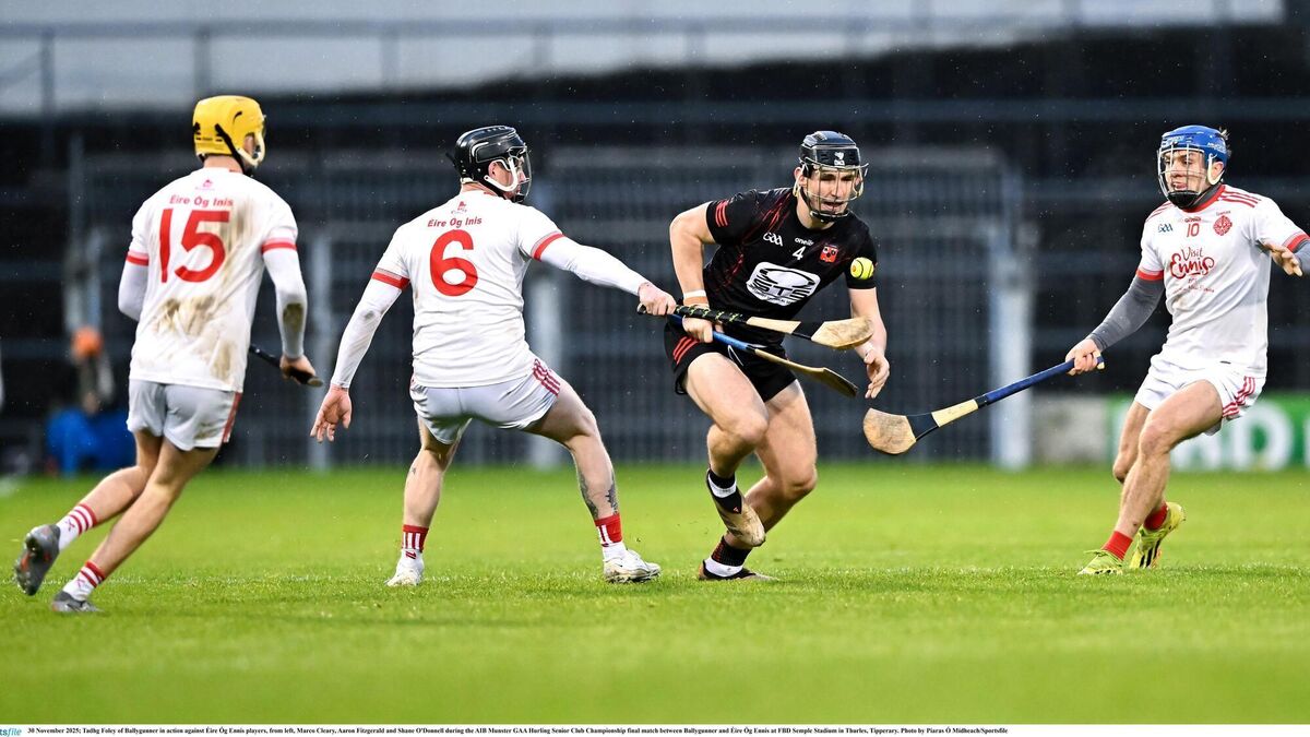 Tadhg Foley of Ballygunner in action against Éire Óg Ennis players, from left, Marco Cleary, Aaron Fitzgerald and Shane O'Donnell. Pic: Piaras Ó Mídheach/Sportsfile
