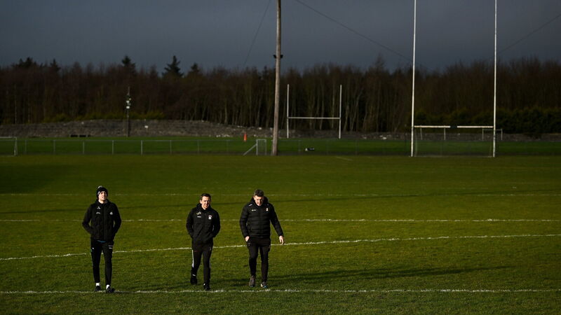 4 January 2026; Referee Rory Hanley, left, Westmeath manager Kevin O'Brien, centre, and Kilkenny manager Derek Lyng walk the grass pitch that was deemed playable, but unavailable, before the cancelled Dioralyte Walsh Cup First Round match between Westmeath and Kilkenny at St Loman's GAA club in Westmeath. Picture: Piaras Ó Mídheach/Sportsfile