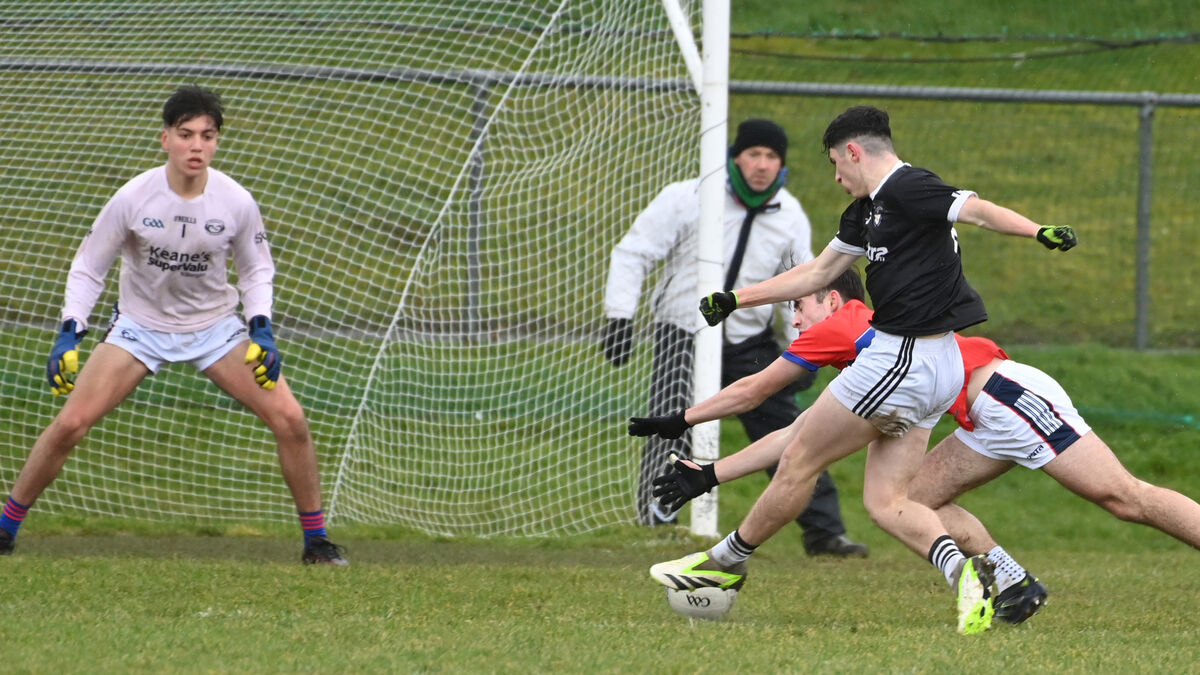 St. Francis College, Rochestown's Padraig McGrath scores the opening goal from IS Killorglin's Sean Griffin and goalkeeper Adam Radny. Pic: Eddie O'Hare