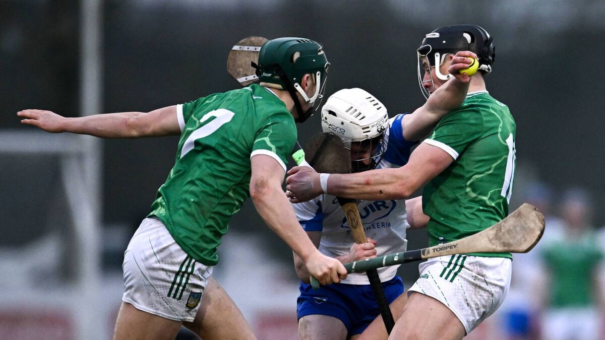 Sean Mackey of Waterford is tackled by Matthew Fitzgerald, left, and Gearoid Hegarty of Limerick during the Co-Op Superstores Munster Senior Hurling League final match between Waterford and Limerick at Mallow GAA Complex in Mallow, Cork. Photo by Ben McShane/Sportsfile