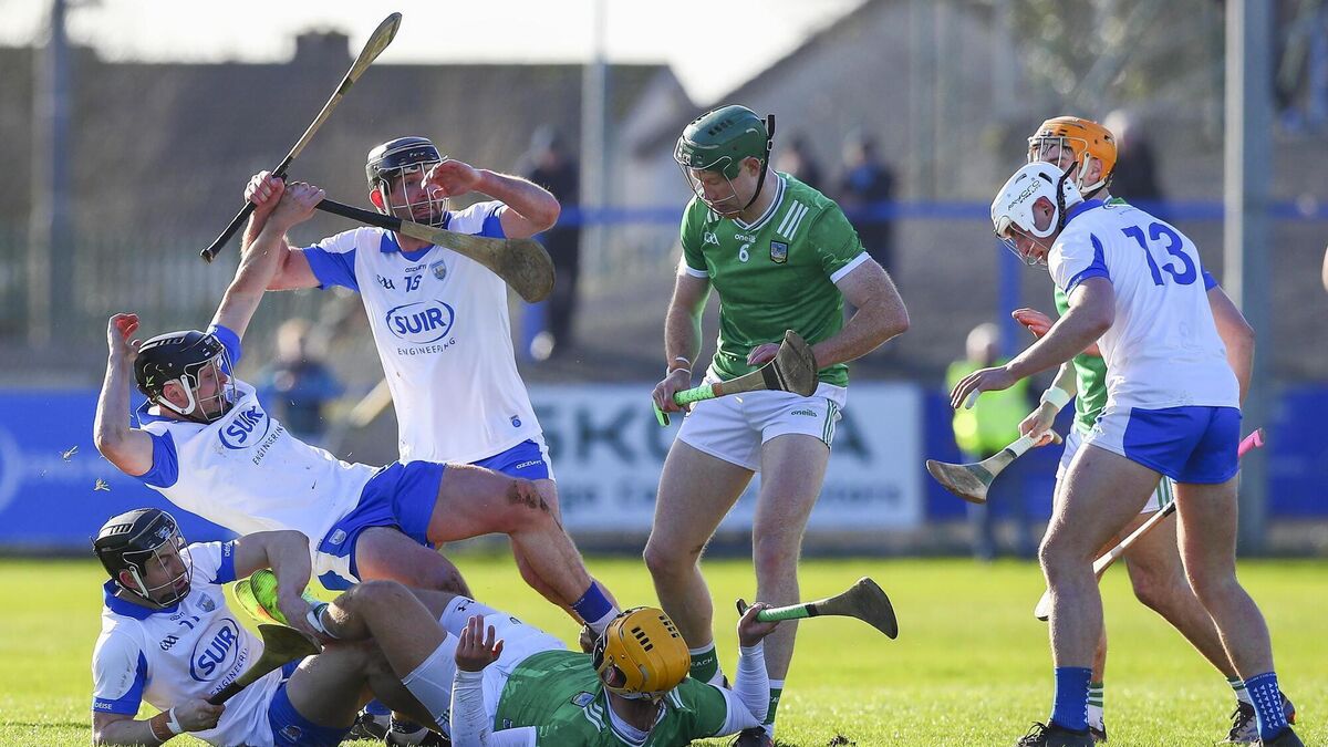 GROUND BATTLE: Limerick's William O'Donoghue clears Waterford's Darragh Lyons from the ruck. Pic: INPHO