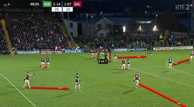 Take Finnian Ă Laoiâs second-half point. It started with a Shane McGrath shot that dropped short. Immediately, Galwayâs forwards stepped up and cut the line. They each raced to mark a free man while Ă Laoi left his wing to condense the space. Had Kerry been able to switch the ball across the pitch or work it to the free man, Galway were wide open.