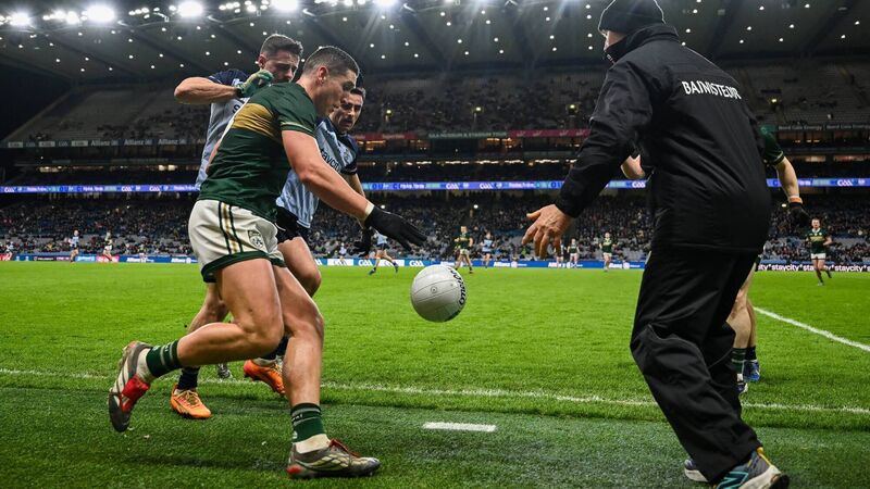 OUTTA THE WAY: Kerry's Joe O'Connor battles Brian Howard, Niall Scully and almost his own gaffer, Jack O'Connor, for possession at Croke Park on Saturday night. Pic: David Fitzgerald/Sportsfile