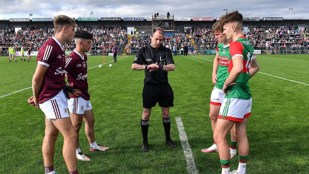 Referee Niall Cullen with Galway joint-captains Jack Lonergan, left, and Ăanna Monaghan and Mayo joint-captains Diarmuid Duffy and Ronan Clarke, right, before the 2022 Electric Ireland GAA Football All-Ireland Minor Championship Final match between Galway and Mayo at Dr Hyde Park in Roscommon. Photo by Piaras Ă MĂdheach/Sportsfile