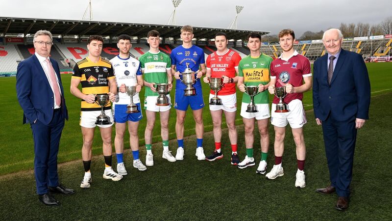 Launching the 2026 McCarthy Insurance Group Cork County Football Leagues. from left, Brendan Harrington CEO McCarthy Insurance Group with winners of last years leagues Div 6 : Conor Dodd, Canovee; Div 2: Timmy O'Connor, Knocknagree; Div 4, Oisin O'Connell, Aghabullogue; Div 1: Thomas Egan, St Finbarr's ;Div 3: Cathal Vaughan, UÃbh Laoire;Div 5: Lawrence Asling, Kilmurry and Div 7: Bill Fleming, Argideen Rangers at SuperValu Páirc Uà Chaoimh. and Pat Horgan, chairman Cork county board at SuperValu Páirc Uà Chaoimh. Picture; Eddie O'Hare