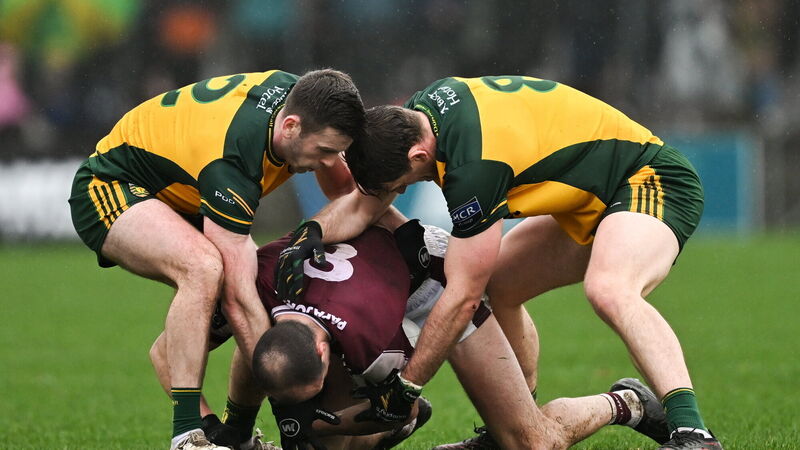 John Maher of Galway in action against Eoghan Bán Gallagher, left, and Hugh McFadden of Donegal. Pic:Ramsey Cardy/Sportsfile