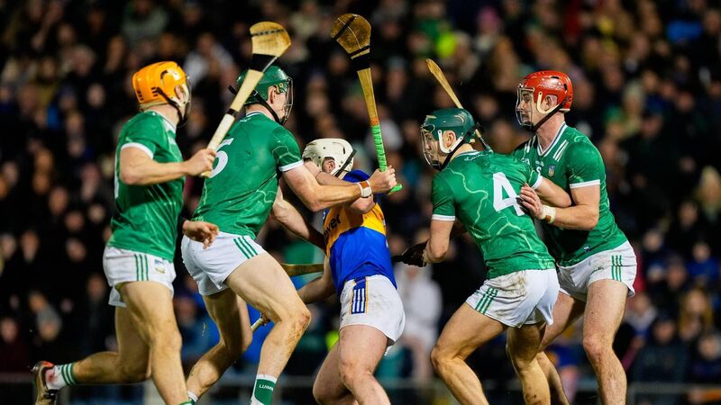 SWALLOWED UP: Tipperary's Darragh McCarthy of Tipperary is tackled by four Limerick players during the Allianz League meeting. Pic:Â James Lawlor/Inpho