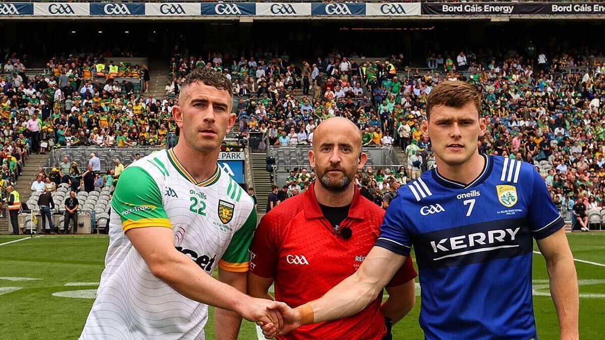 MAN IN THE MIDDLE: Referee Brendan Cawley with Donegal's Patrick McBrearty and Kerry's Gavin White before the 2026 All-Ireland Senior Football Championship Final. Pic: ©INPHO/Ryan Byrne