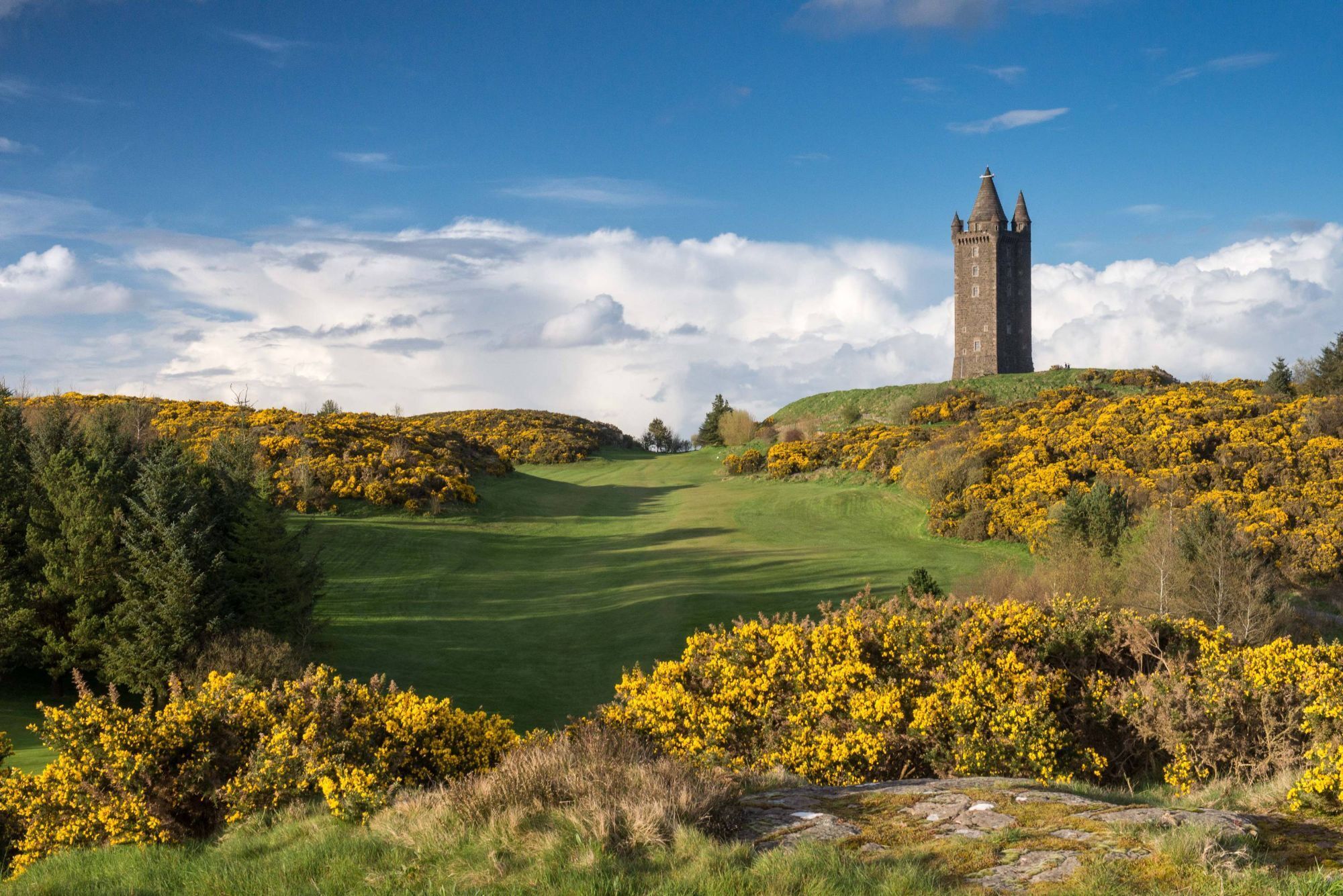 You climb to the tee with the hole behind you. Then you turn and see the 1st in all its glory. The flanks of gorse loom above the fairway as it rises and rises over bumpy terrain to a green sitting under Scrabo Tower. You need to be a long way up that hill to reach the green in two, but the farther up you go the more the fairway narrows. The small green is tucked in next to more gorse and there’s a significant slope to the putting surface. Always be short and right of the pin.