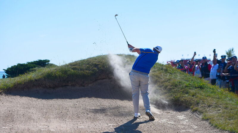 Shane Lowry of Team Europe chips from a bunker during his Friday afternoon fourballs match with Rory McIlroy against Tony Finau and Harris English. Picutre: Tom Russo/Sportsfile