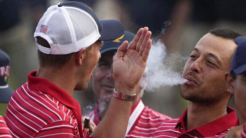 WHITE SMOKE: Xander Schauffele celebrates the US team's Presidents Cup success with Jordan Spieth at Quail Hollow Club in Charlotte.