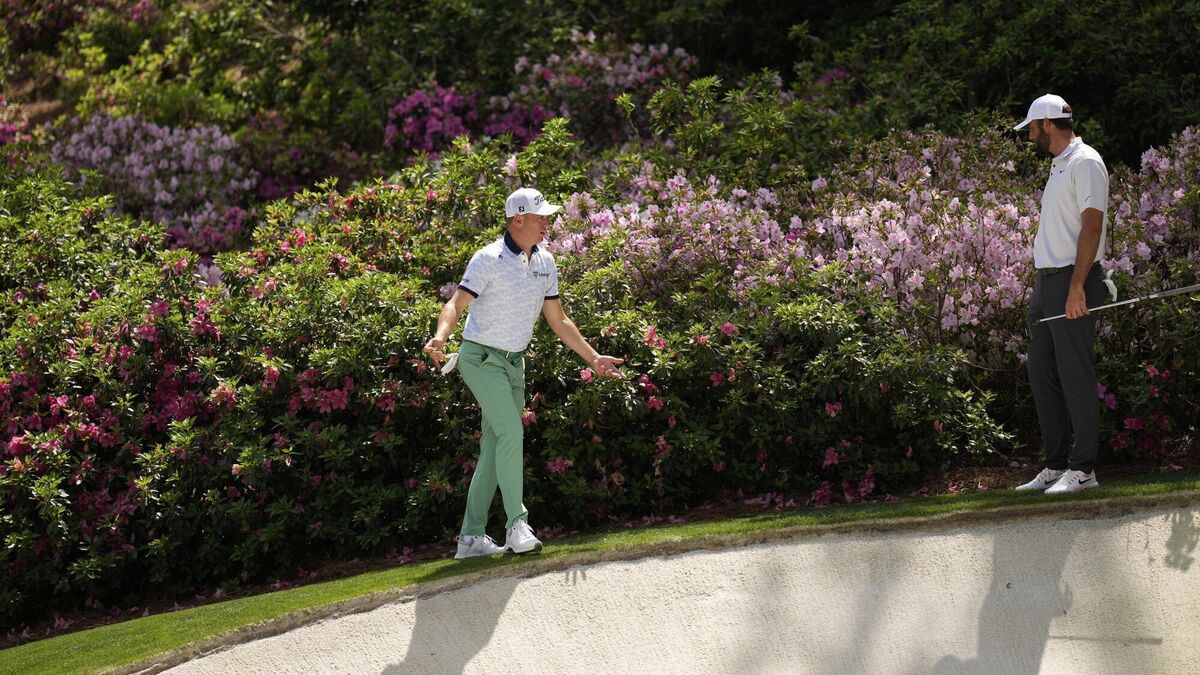 ON THE EDGE: Scottie Scheffler helps Justin Thomas look for his ball on the 13th hole during the first round at the Masters golf tournament, Thursday, April 10, 2025, in Augusta, Ga. Pic: AP Photo/David J. Phillip