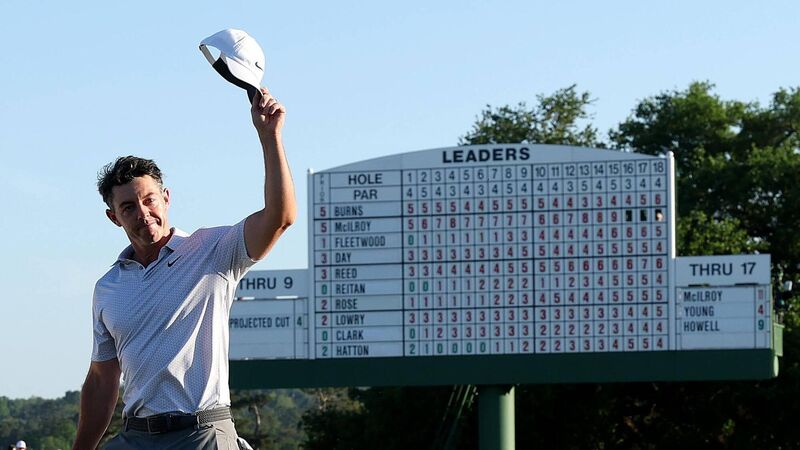 NICE DAY'S WORK: Rory McIlroy walks off the 18th green six shots in front at the Masters at Augusta National Golf Club. Pic: Andrew Redington/Getty Images