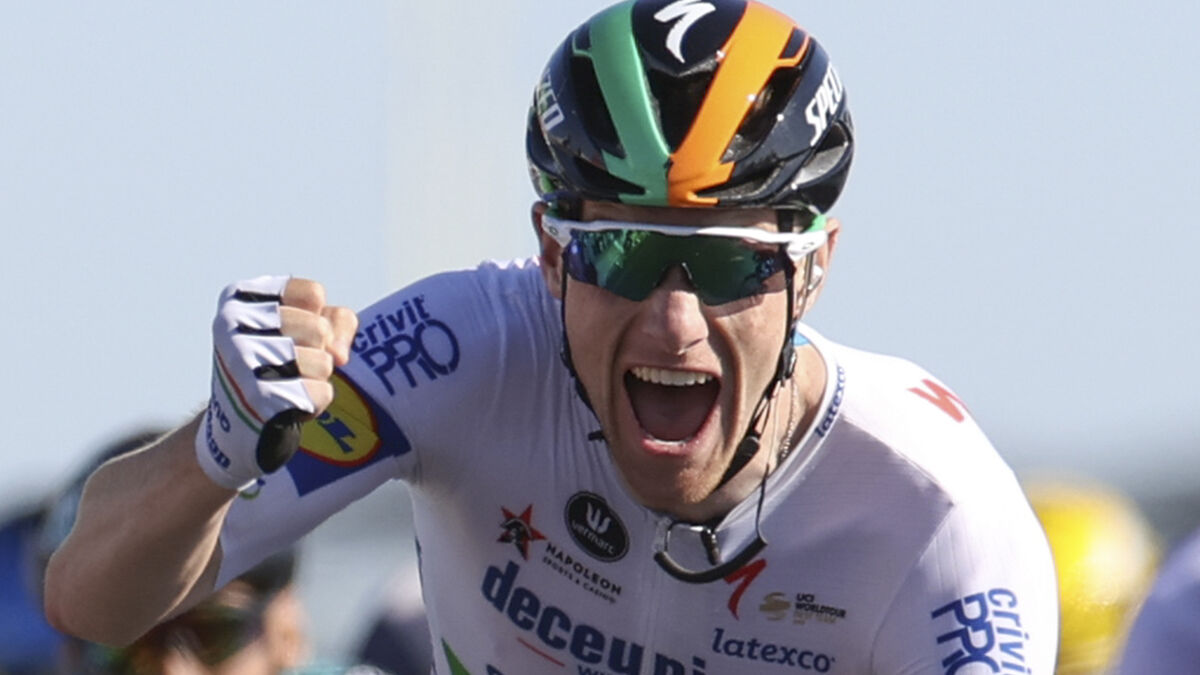 Ireland's Sam Bennett celebrates as he crosses the finish line to win stage 10 of the Tour de France from Ile d'Oleron to Ile de Re. (Kenzo Tribouillard/Pool via AP)