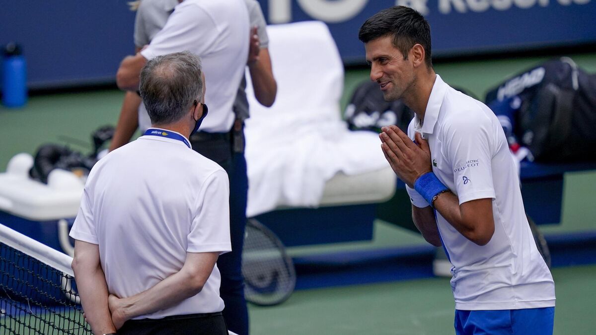 Novak Djokovic, right, was thrown out of the US Open after accidentally hitting a line judge with a ball (Seth Wenig/AP)