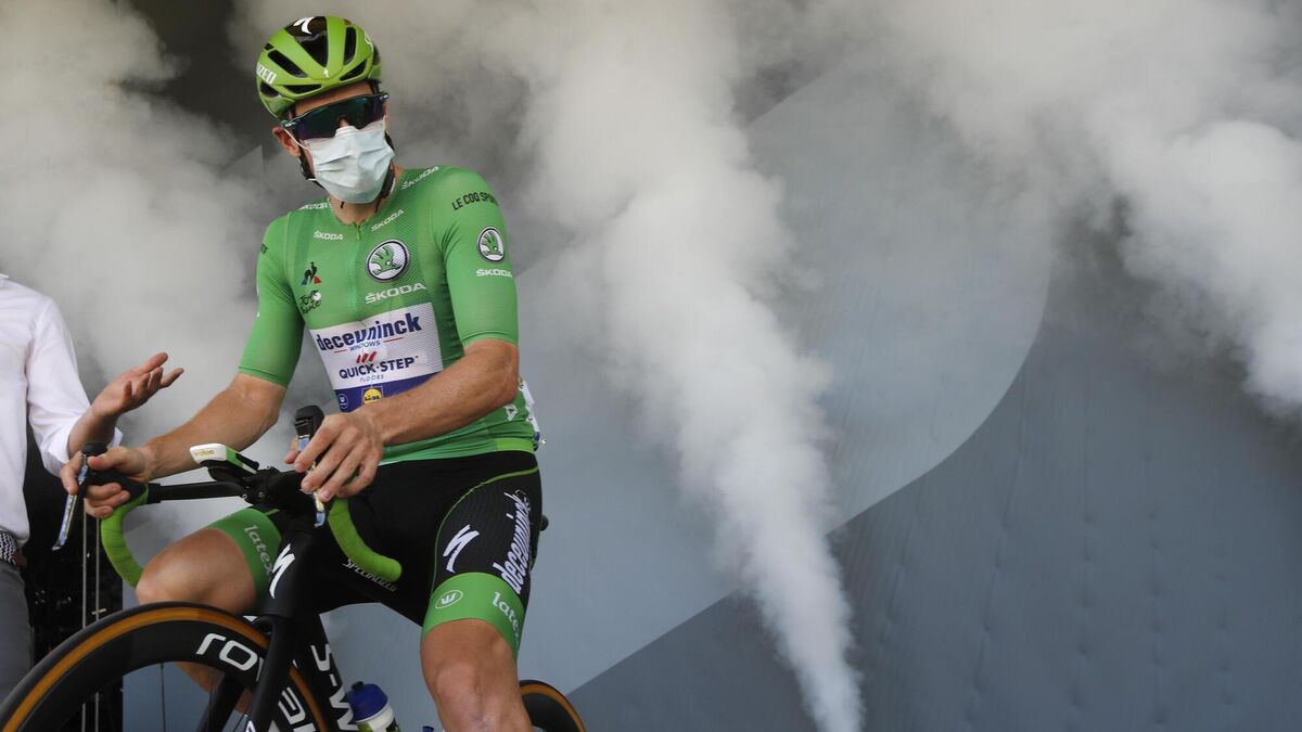 Ireland's Sam Bennett, wearing the best sprinters green jersey, arrives for the start of the 17th stage. (AP Photo/Christophe Ena, Pool)