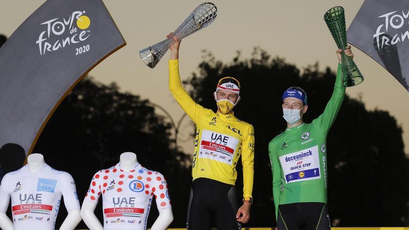 Sam Bennett, wearing the best sprinter's green jersey, with Slovenia's Tadej Pogacar, centre, who won the overall yellow jersey, the best climber's polka dot jersey, and the best young rider's white jersey. (AP Photo/Christophe Ena)