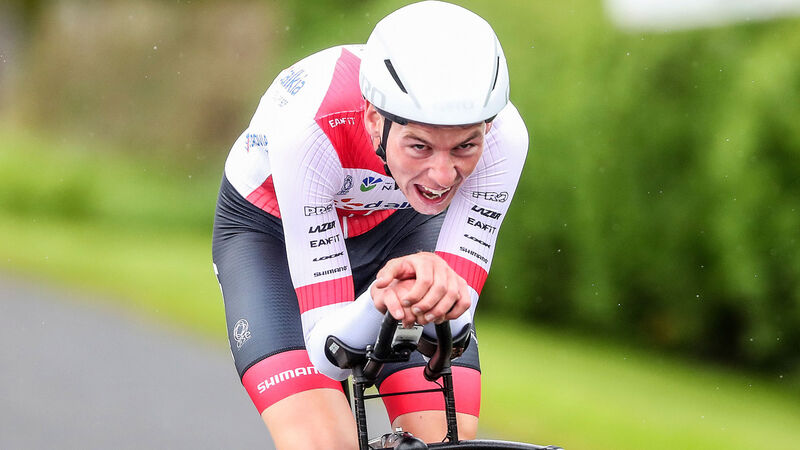 Conn McDunphy on his way to winning the men's senior time trial title at the Cycling Ireland National Championships in Knockaderry, Co. Limerick at the start of the month. Picture: INPHO/Bryan Keane