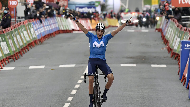 Movistar's Marc Soler celebrates after winning the second stage of La Vuelta between Pamplona and Lekunberri. (AP Photo/Alvaro Barrientos)