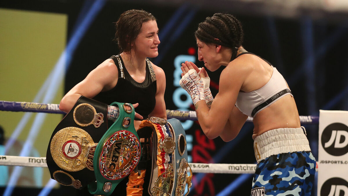 Katie Taylor is congratulated by Miriam Gutierrez after the bout at Wembley Arena in London on Saturday night. Picture: Inpho/Matchroom Boxing/Mark Robinson