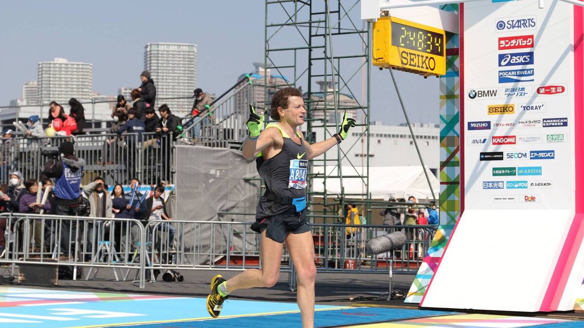 Liam Cotter crosses the line at the Tokyo Marathon. He has completed the 'Big 6' marathons around the world - finishing all of them in under 2hours 50 minutes