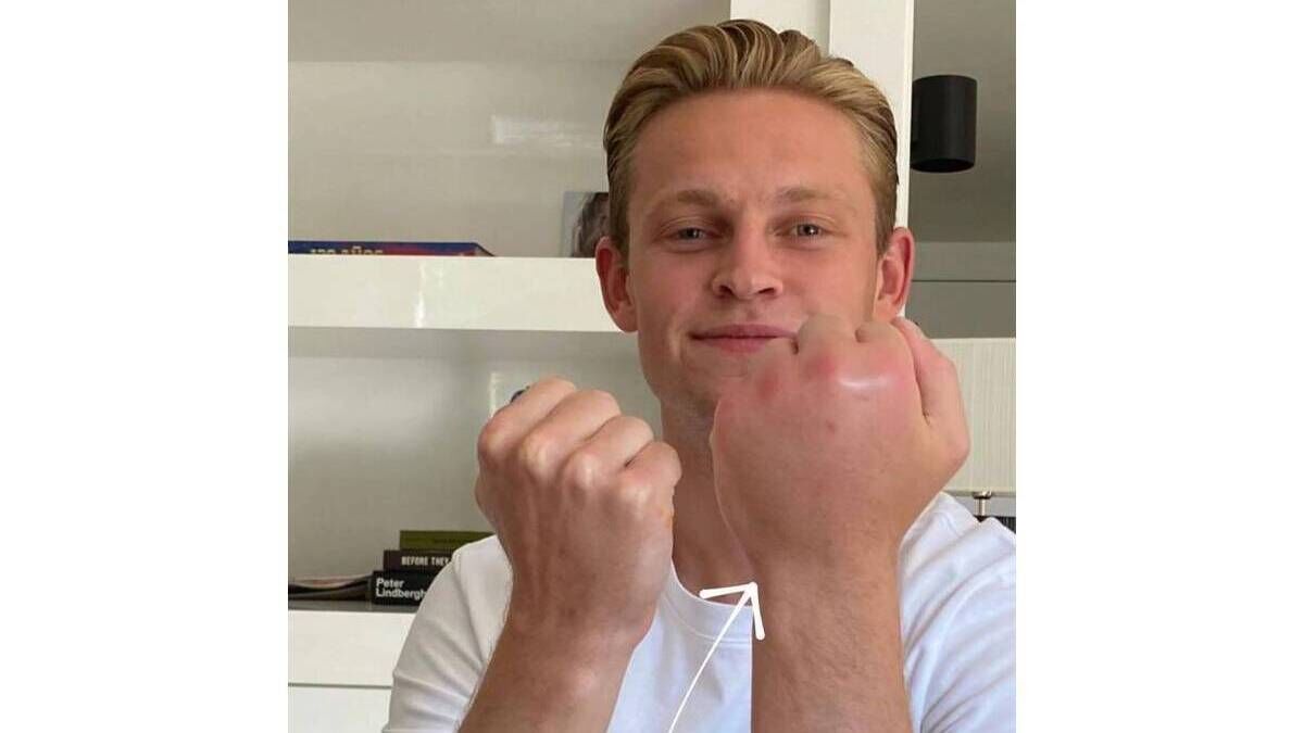 Barcelona midfielder Frenkie de Jong posted this alarming-looking picture of his swollen hand, which was the result of an allergic reaction to a bee sting. Picture: Instagram / @mikkykiemeney