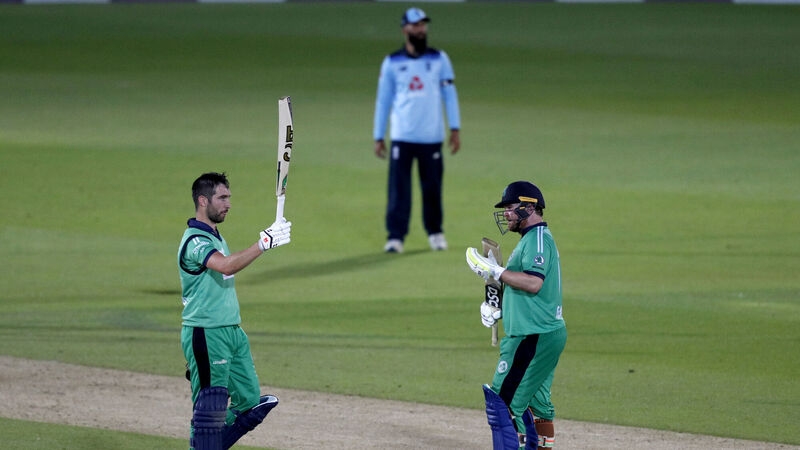 Ireland captain Andrew Balbirnie (left) celebrates reaching his century with team-mate Paul Stirling during the third One Day International match against England which Ireland won in dramatic fashion. Picture: Adrian Dennis/PA