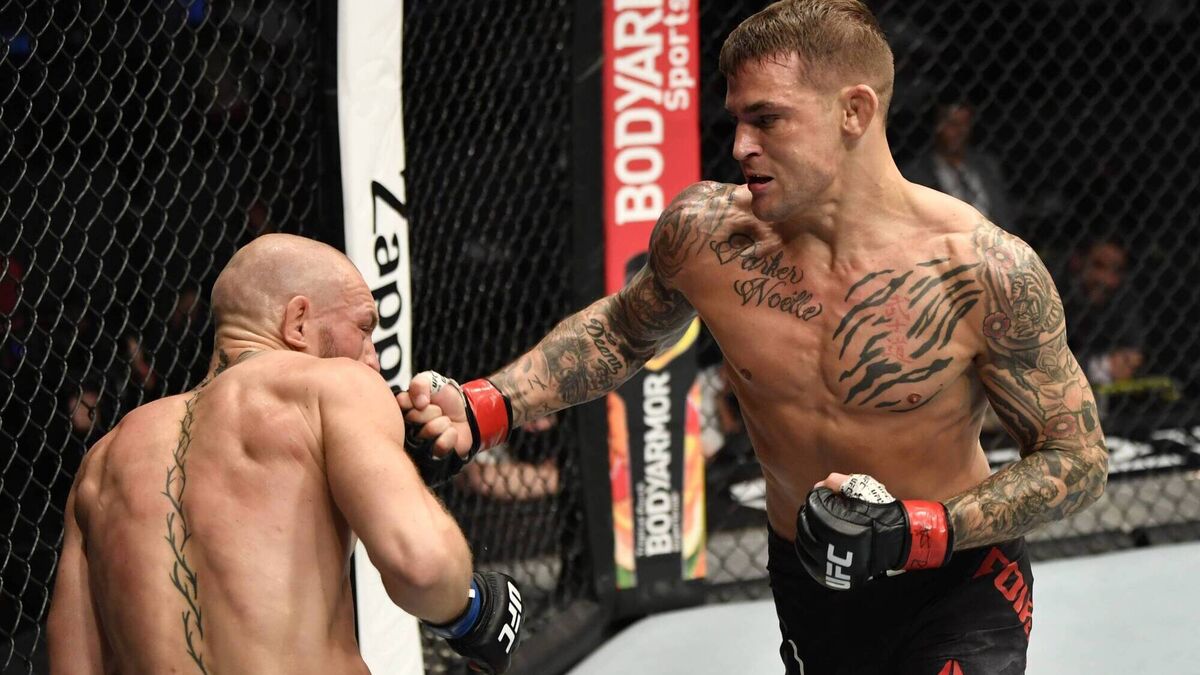 Dustin Poirier connects with Conor McGregor in their lightweight headline bout of UFC 257 in the Etihad Arena in Abu Dhabi. Picture: Jeff Bottari/Getty Images
