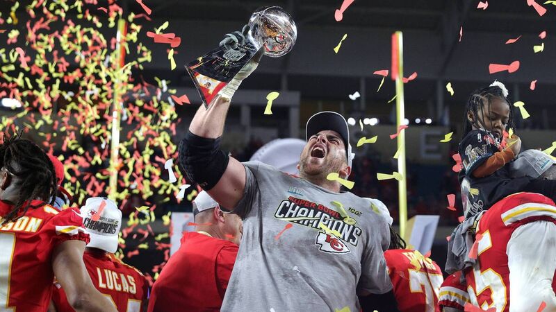 Laurent Duvernay-Tardif of the Kansas City Chiefs raises the Vince Lombardi Trophy after defeating the San Francisco 49ers in Super Bowl LIV last February. Picture: Tom Pennington/Getty Images