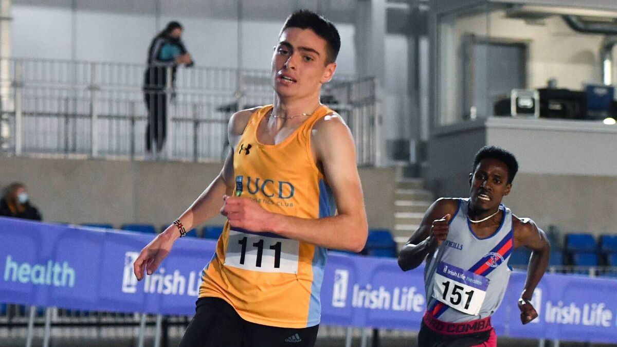 Darragh McElhinney of UCD AC, left, and Hiko Tonosa of Dundrum South Dublin AC, competing in the Men's 3000m at the Irish Life Health Elite Athlete Indoor Micro Meet last month. Photo by Sam Barnes/Sportsfile