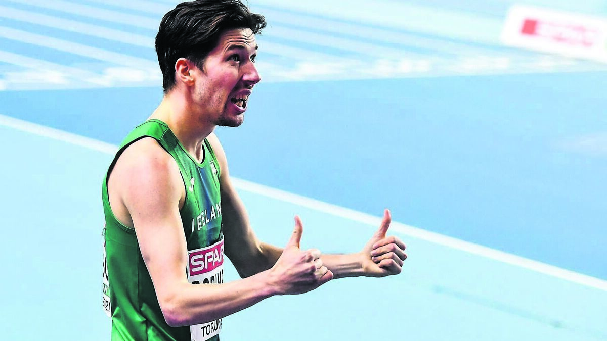 THUMBS UP: Ireland’s Paul Robinson was thrilled with his performance after finishing third in his heat of the Men’s 1500m during the European Indoor Athletics Championships in Torun, Poland, last night. Robinson and countryman Andrew Coscoran both qualified for tonight’s 1500m final.