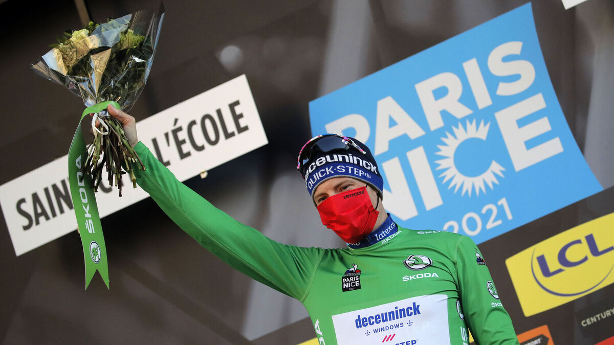 Sam Bennett of Ireland wearing the green jersey of best sprinter, celebrates on the podium after winning the first stage of the Paris Nice cycling race over 166km last week. Picture: AP Photo/Christophe Ena